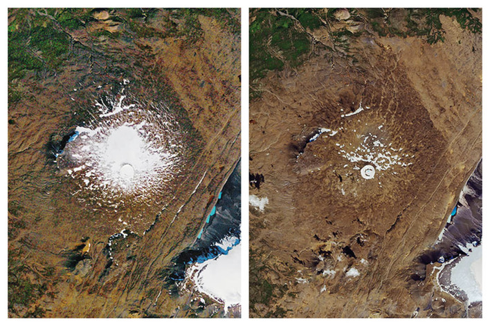 这是由美国国家航空航天局提供的1986年9月14日(左)和2019年8月1日冰岛奥克冰川卫星图