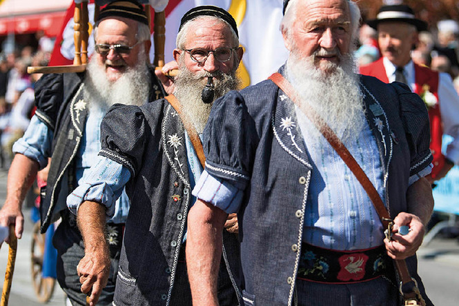 在瑞士中部度假胜地因特拉肯,留长胡须的老人们身着传统服装参加民俗文化节游行活动