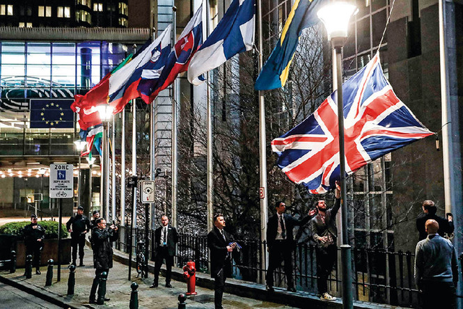 2020年1月31日,在比利时布鲁塞尔,人们降下欧洲议会外的英国国旗
