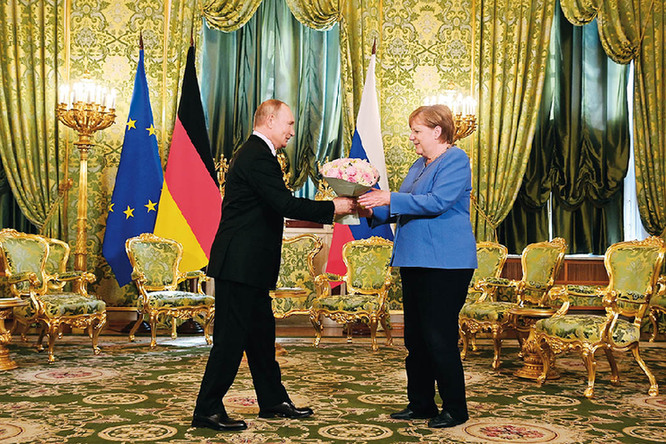 2021年8月20日,在俄罗斯首都莫斯科,俄罗斯总统普京(左)欢迎来访的德国时任总理默克尔
