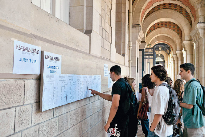 2022年7月5日,在法国巴黎伏尔泰中学,学生查看高中毕业会考成绩