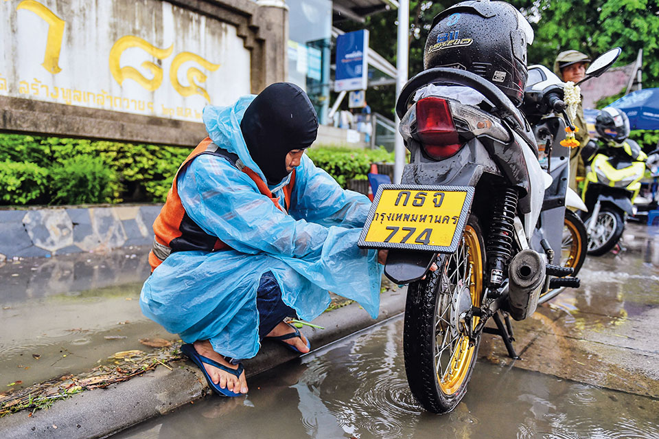 2017年5月27日,在泰国曼谷,一名“摩的”出租车司机检查进水的车辆
