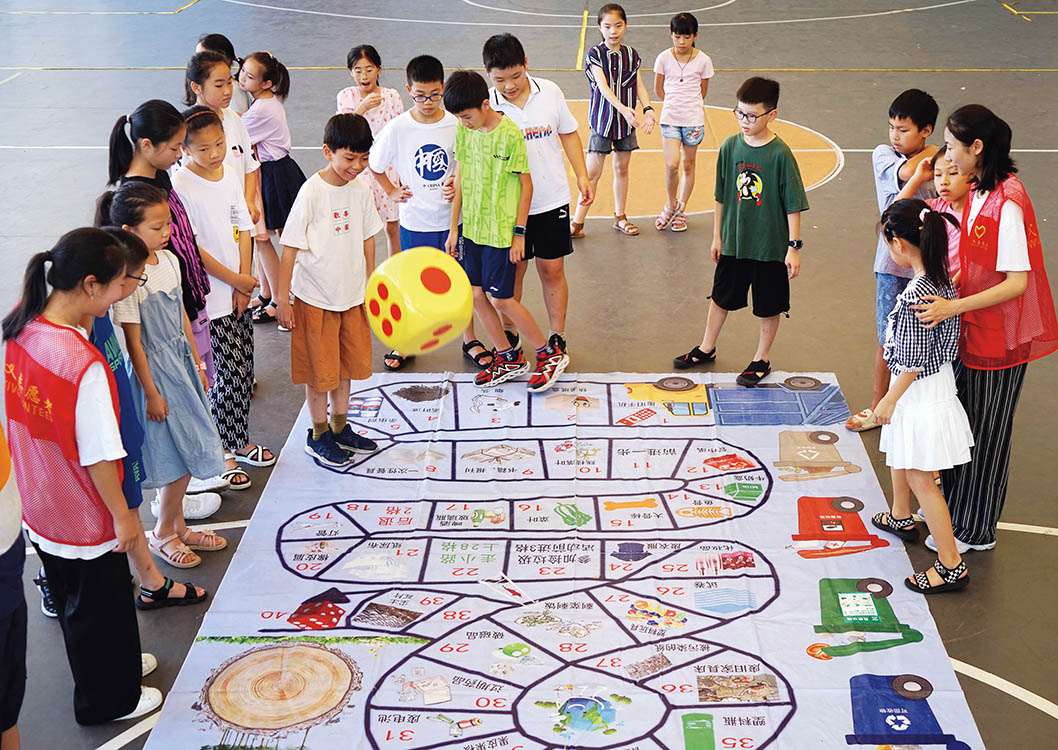 外来务工人员子女暑期托管班的小朋友在浙江省武义县青少年宫玩垃圾分类棋