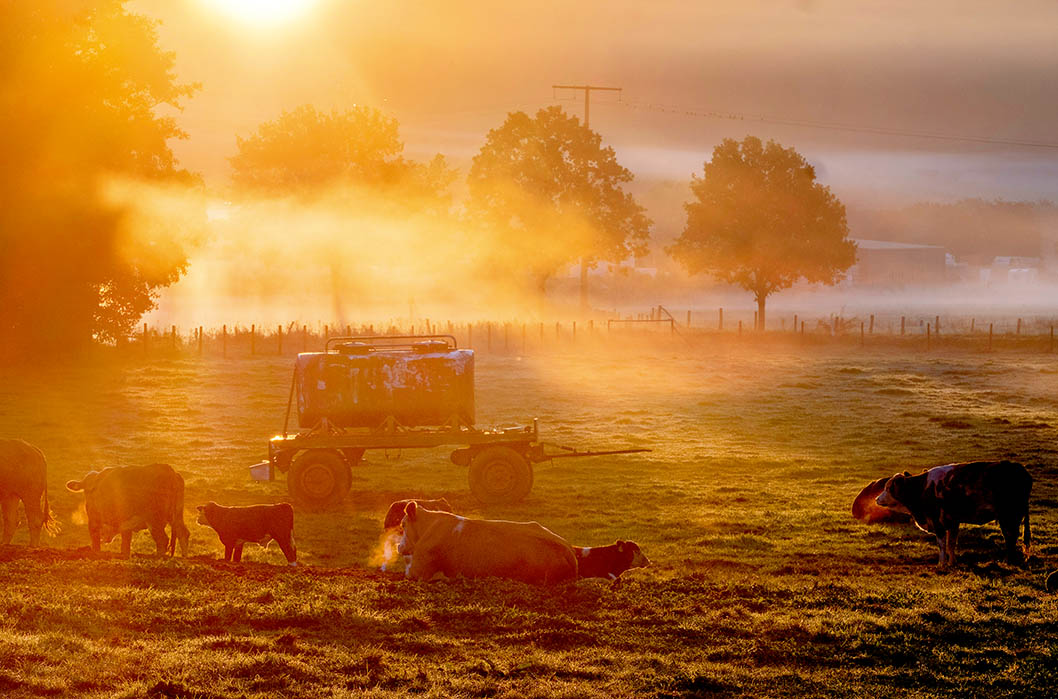 这是2023年9月8日在德国法兰克福附近的韦尔海姆拍摄的日出时分的农场