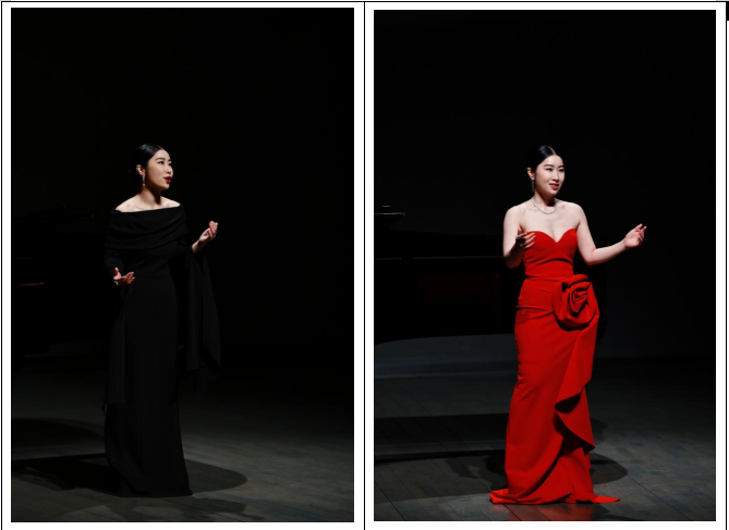 中场休息后,女高音曹亚琼身着红裙登场,引领观众走进中国艺术歌曲的诗意天地。她首先带来黄自的《花非花》,这首歌的歌词取自唐代诗人白居易的同名诗作。女高音曹亚琼轻声吟唱,凭借细腻的嗓音,将“花非花,雾非雾”的朦胧美感和“夜半来,天明去”的转瞬即逝之感悠悠传出,让观众仿佛置身于千年前的诗意场景,体悟着人生的无常与美好事物的易逝。《我住长江头》响起,这首作品改编自宋代婉约派词人李之仪的同名诗词,其婉转的旋律寄托着千年相思,女高音曹亚琼用歌声传递出其中绵延的思念,让观众沉浸在这份深情之中。压轴曲目《送别》,更是将氛围推向高潮。女高音曹亚琼采用中西交融的咏叹调处理方式,伴着悠扬的钢琴声唱出“长亭外,古道边”,清澈透亮的嗓音与哀而不伤、底蕴深沉的歌词、旋律相得益彰,使观众感受到中国古诗词的含蓄之美和西方古典音乐独特的表现力。