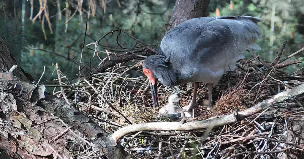 据悉,此次成功孵化的朱鹮宝宝出生在一株视野开阔、枝叶稀疏的高大松树顶端。孵蛋和育雏期间,工作人员通过专业设备24小时远程监测孵化情况和巢穴状况,并定时抛撒泥鳅补充食物来源,为朱鹮繁殖、哺育护航。