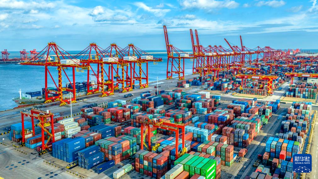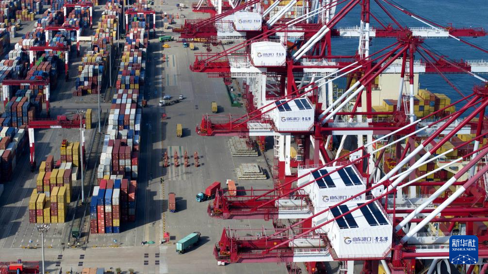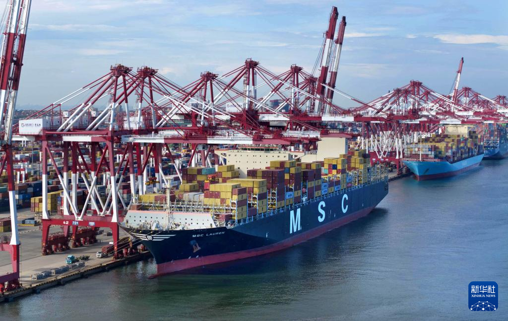繁忙的山东港口青岛港前湾集装箱码头(8月6日摄,无人机照片)。