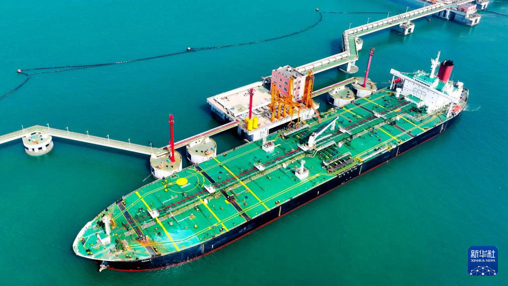 3月29日,在山东港口日照港岚山港区30万吨级油品码头,船舶停靠进行卸油作业(无人机照片)。
