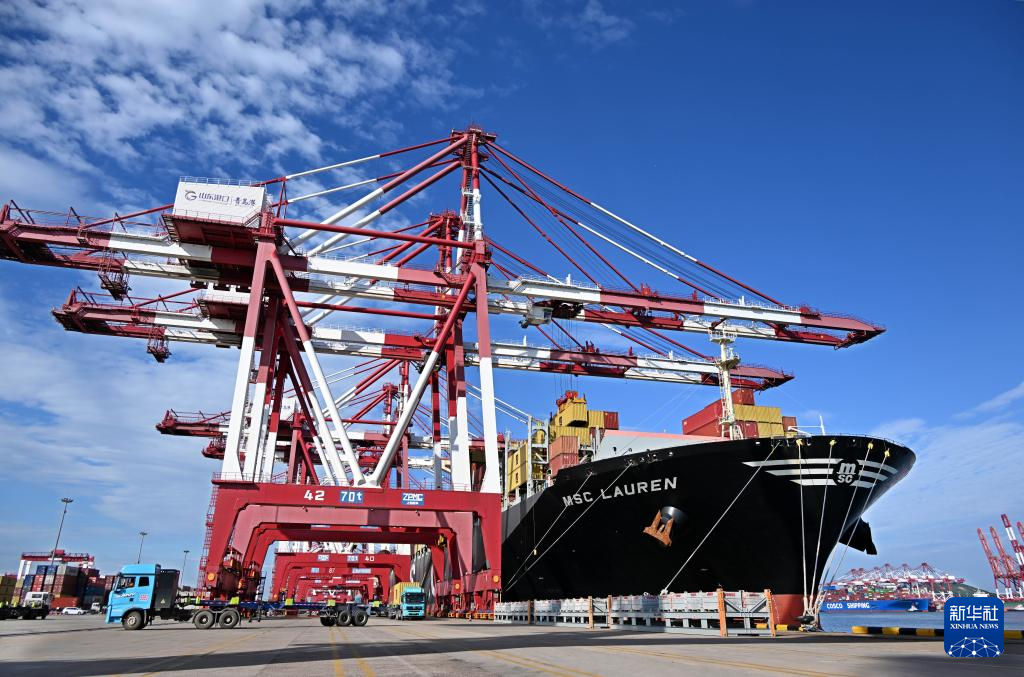 8月6日,货轮在山东港口青岛港前湾集装箱码头装卸集装箱。