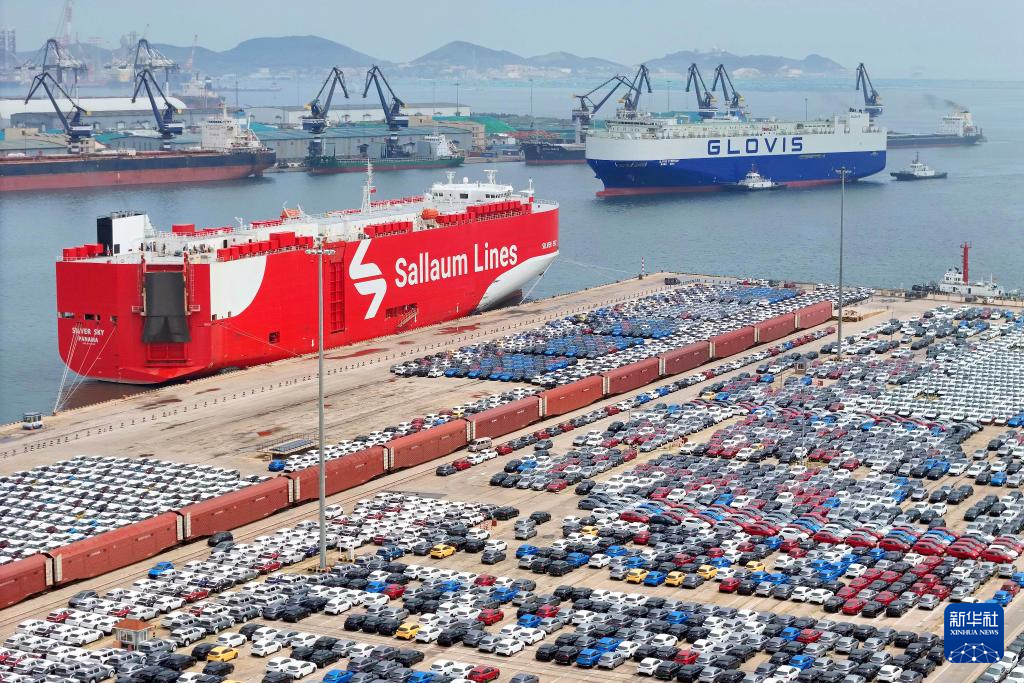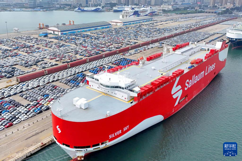 8月6日,在山东港口烟台港,滚装船在装运外贸车辆(无人机照片)。