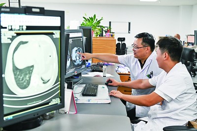 在江苏省海安市人民医院,医学影像科医生在电脑上读片。新华社记者 季春鹏摄