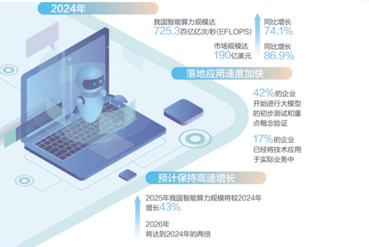 周震刚说:“预计未来两年,中国智能算力规模仍将保持高速增长,其中2025年将较2024年增长43%,2026年将达到2024年的两倍。”