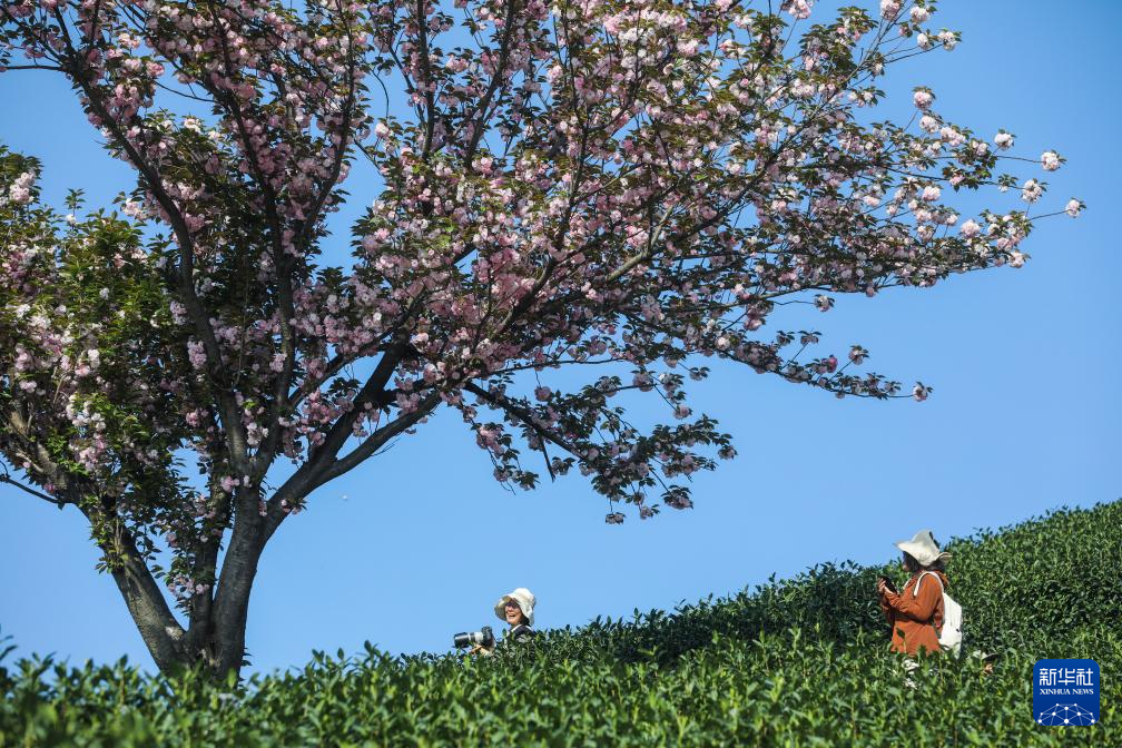 4月6日,游客在拔山村万亩茶园观赏樱花。新华社记者 徐昱 摄