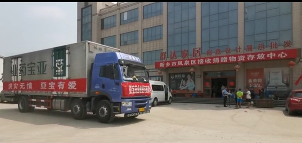 7月30日上午10时,一辆写着“亚宝药业驰援河南新乡”“洪灾无情 亚宝有爱”“河南加油 新乡加油”条幅的大货车满载着药品,抵达河南省新乡市凤泉区红十字会。车上药品共价值113万元,是亚宝药业集团紧急调集起来,驰援当地抗洪救灾工作的。