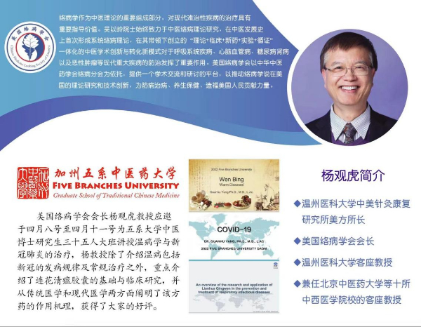 近日,美国络病学会会长杨观虎教授应邀为加州五系大学(Five Branches University)中医博士研究生就温病学与新冠肺炎的治疗在线讲解,该校来自世界各地的35名博士在线聆听并积极互动。杨观虎介绍了包括新冠肺炎在内的“温病”的发病规律及常规治疗,并重点分享了连花清瘟胶囊的基础与临床研究,从传统医学和现代医学两方面阐明该方药的作用机理。