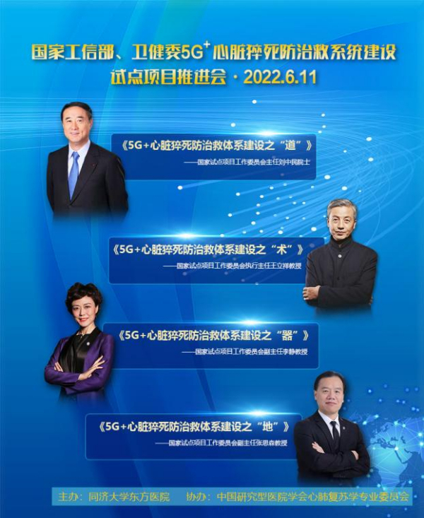 为更好地落实国家、卫健委5G+心脏猝死防治救系统项目开展,由本项目牵头单位同济大学东方医院主办,中国研究型医院学会心肺复苏学专业委员会协办,来自全国心肺复苏领域的专家学者百余人,于6月11日参加国家工信部、卫健委5G+心脏猝死防治救系统试点项目推进研讨会线上会议,本次会议由同济大学东方医院副院长许朝辉教授、中国研究型医院学会心肺复苏学专业委员会副秘书长吕军教授共同主持,由本项目工作委员会主任、中国研究型医院学会心肺复苏学专业委员会名誉主任委员刘中民院士,本项目工作委员会执行主任、中国研究型医院学会心肺复苏学专业委员会主任委员王立祥教授,中国研究型医院学会心肺复苏学专业委员会副主任兼项目科技转化建设小组长李静教授,中国研究型医院学会心肺复苏学专业委员会副主任兼项目科普应用建设小组长张思森教授分别做了《5G+心脏猝死防治救体系建设之“道”》、《5G+心脏猝死防治救体系建设之“术”》、《5G+心脏猝死防治救体系建设之“器”》、《5G+心脏猝死防治救体系建设之“地”》报告。
