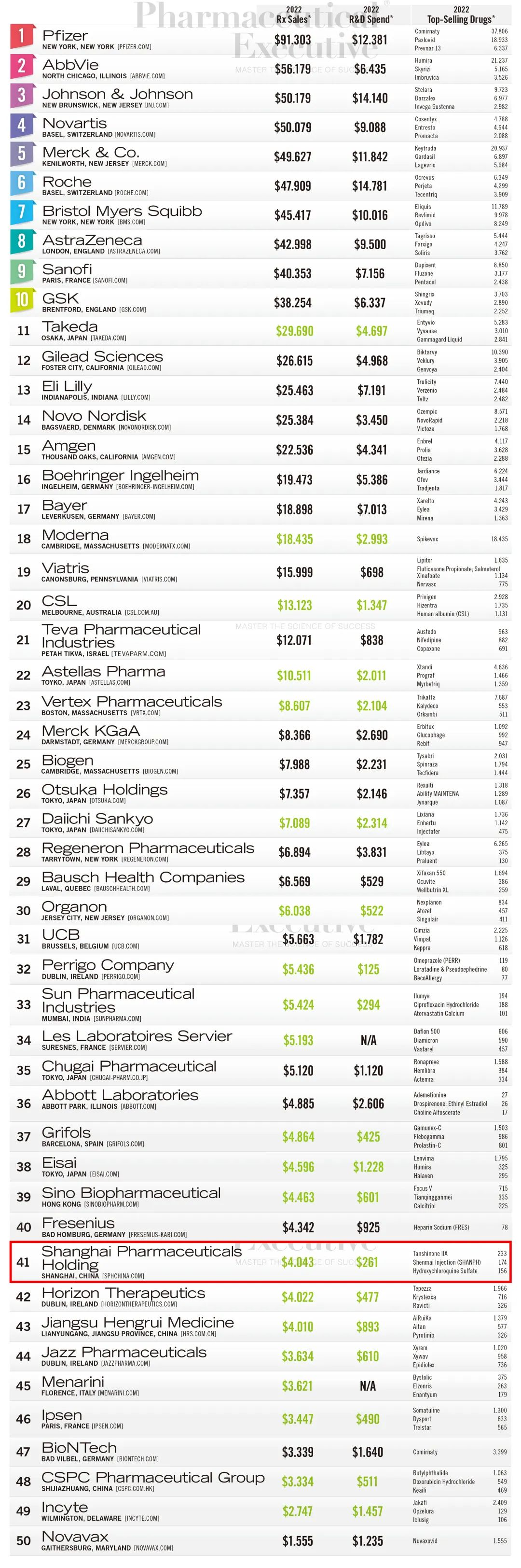 据悉,《制药经理人》是国际制药界知名的医药专业杂志,为国际医药界顶级CEO或经理人提供行业信息和战略决策借鉴,今年是该杂志第23次推出全球制药企业TOP50榜单,该榜单主要依据各大药企的处方药销售收入、年度研发投入以及核心产品收入进行排名,其主要数据由全球医药市场研究机构EvaluatePharma提供支持。