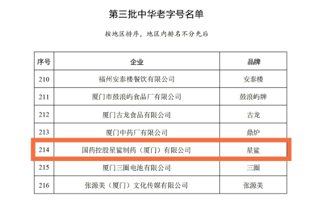 日前,商务部联合文化和旅游部、市场监管总局、国家知识产权局以及国家文物局等部门共同公布第三批中华老字号名单,国药控股星鲨制药(厦门)制药有限公司(以下简称“国控星鲨”)上榜,成功入选新一批中华老字号企业。