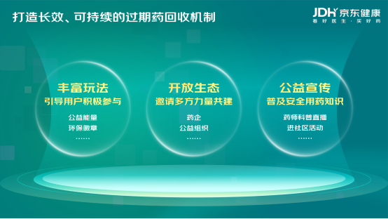 据了解,本次公益项目京东健康设计了多种互动,将提供公益能量、环保勋章、优惠券等更多丰富的玩法,引导用户积极参与。为了能让用户更多的参与,京东集团副总裁、京东健康医药部负责人介绍,京东健康组织具备临床药学经验的执业药师组成线上服务团队,能够为用户提供药物治疗评价、诊后用药方案调整、药物治疗方案随访等一系列专业化在线药学服务,针对过期药的危害与回收意义,药师团队可通过直播、视频、图文等通俗易懂形式,持续进行科普,提高用户的认知度。