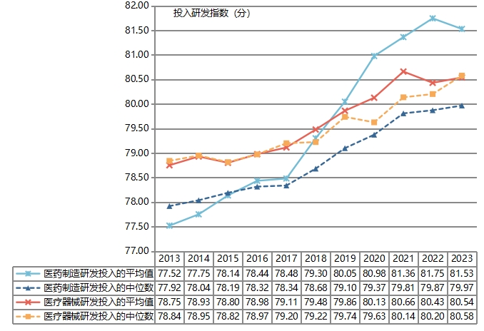 从行业角度来看,上升趋势,在中国医药企业的二级行业-医药制造行业和医疗器械行业均有所体现,中国医药制造企业研发投入指数的平均值从2013年度的77.52分增长至2023年度的81.53分,增长了4.01分,增长率5.17%,中国医疗器械企业也不甘落后,其研发投入指数的平均值从2013年度的78.75分增长至2023年度的80.54分,增长了1.79分,增长率为2.27%。