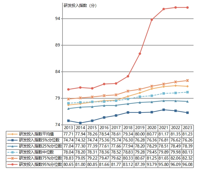 数据显示,在这过去的十一年间,中国医药企业研发投入指数总体呈现波动上升趋势。具体而言,其平均值从2013年的77.71分增长至2023年的81.23分,增长了3.52分,增长率为4.53%。这一积极发展的态势,在各分位数(不同研发投入水平)企业中均得到了充分体现。尤为值得一提的是,头部企业的增长尤为显著,其平均值从2013年度的80.65分增长至2023年度的96.08分,增长了15.43分,增长率为19.13%。