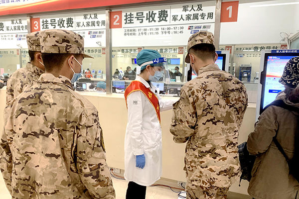↑联合为军服务专区工作人员为就诊军人答疑