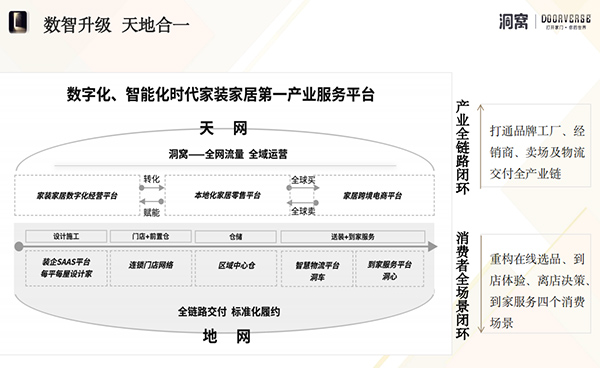 2022年,居然之家在“数字化、智能化时代家装家居第一产业服务平台”的战略目标指引下,以“洞窝”为核心,加大研发与运营投入,自建私域流量平台,精准赋能线下卖场及商户,打造S2B2C模式的数字化产业服务平台。除了打造线上流量平台“天网”--“洞窝”之外,居然之家还以实体店为基础,通过中心仓、前置仓和到家服务实现交付全链路闭环,打造线下物流交付“地网”。
