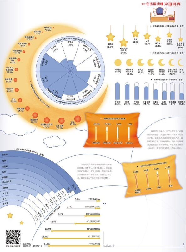 在快节奏的现代生活中,睡眠问题困扰着越来越多人,也催生了蓬勃发展的睡眠经济。《2025年中国睡眠健康调查报告》显示,我国18岁及以上人群的睡眠困扰率为48.5%,且随着年龄增长这一比率在逐渐上升。2024年,我国睡眠经济市场规模预计突破5000亿元。