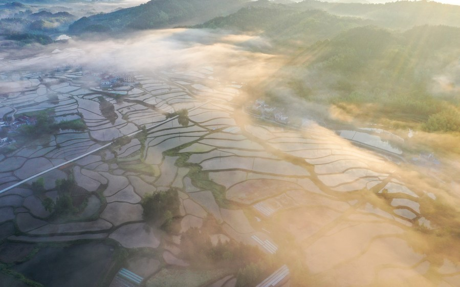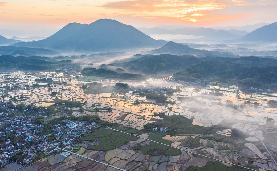 4月27日拍摄的宣城市旌德县兴隆镇三山村晨景(无人机照片)。新华社发(江建兴摄)
