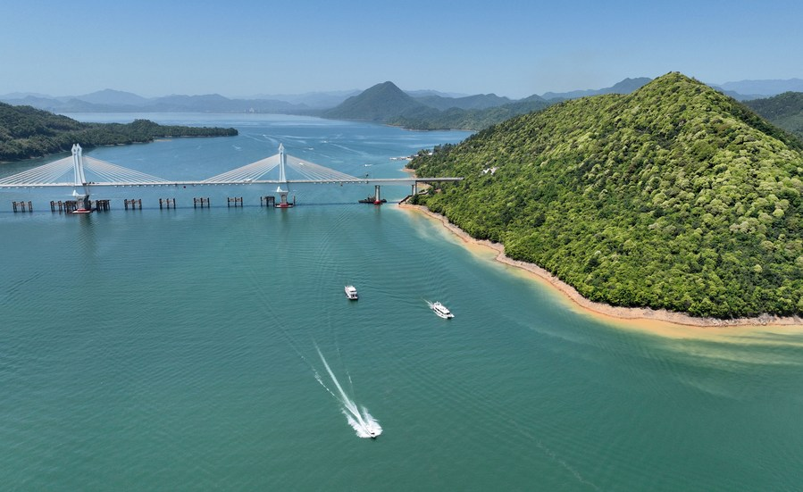 5月1日,游客在安徽省黄山市太平湖上乘船游玩(无人机照片)。新华社发(沈果摄)