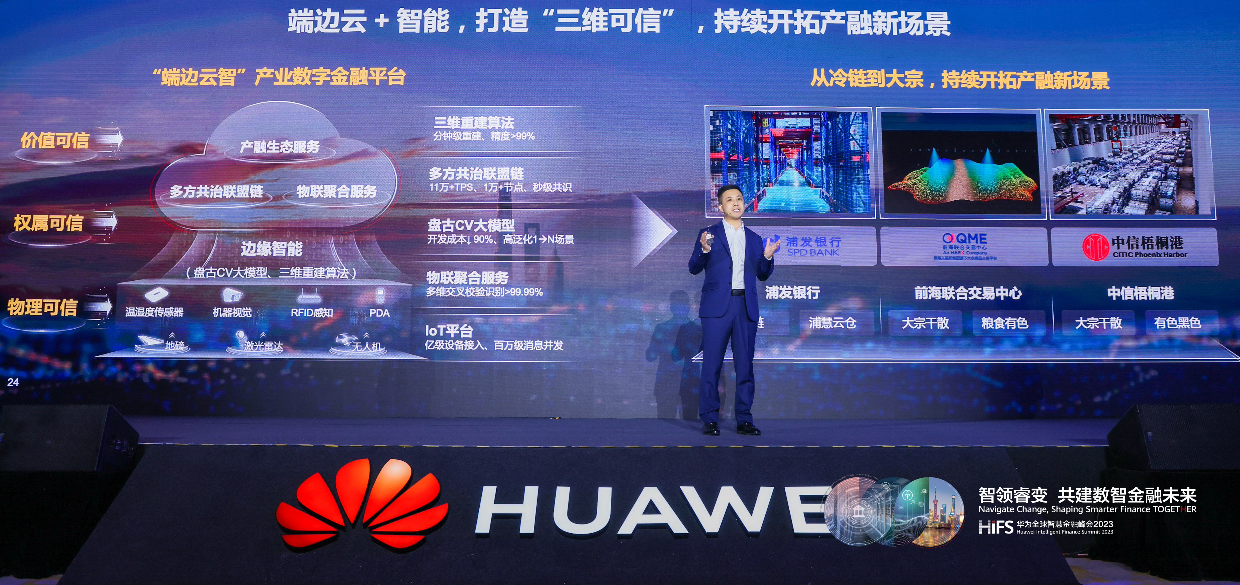 落地到具体场景,华为携手鼎桥通信、软通动力、龙田科技、先施科技等生态伙伴,联合发布了产业金融动产金融仓解决方案,通过“端边云+智能”的产业数字金融平台,助力实现物理可信、权属可信、价值可信。并在冷链、粮食、有色、黑色等场景都实现了创新方案验证落地。在冷链场景,通过云边端物联网数字孪生技术、基于盘古CV大模型集成伙伴算法,实现冷链监管准确率>98%;在大宗干散和堆垛场景,室内仓通过激光点云,室外仓通过倾斜摄影,实时采集资产的在库信息,并利用华为独特的三维重建算法,有效还原现场体积,实现在库货物状态精准测量比对。最终实现每条交易事件可追踪,每件货物检测可信任,每个物品相应的行为可识别。