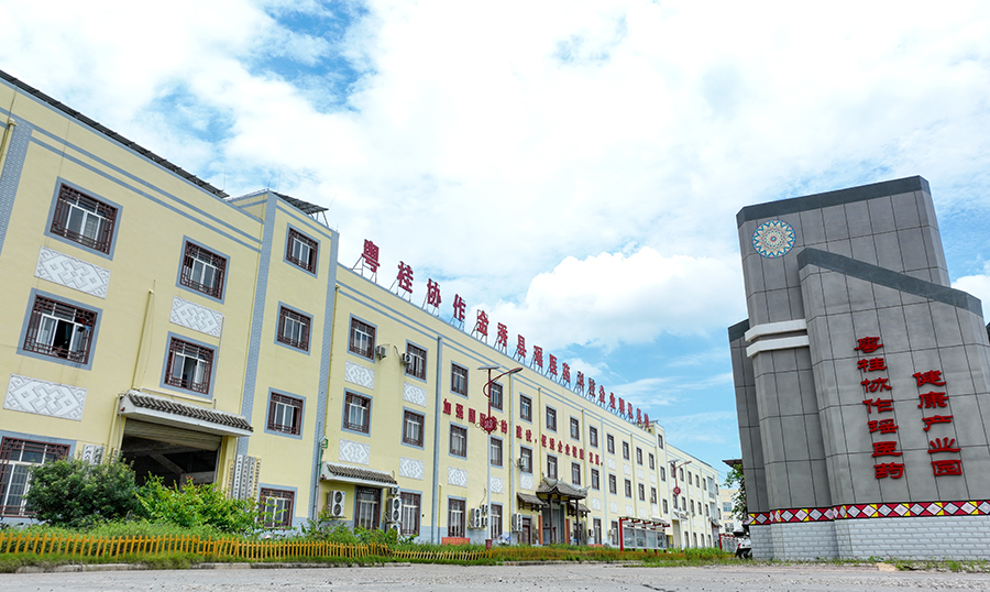 在投入粤桂协作资金4000多万元建立的粤桂协作瑶医药健康产业园里,室外的绿地上,青翠而茂盛的水泽兰、扶芳藤等中草药在生长旺盛,随着微风轻轻摆动;楼内的车间里,一包包瑶浴药包正在生产线上制作、包装,独特的草药香味弥漫在园区里。