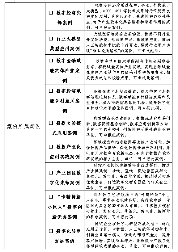 在数字经济发展过程中,企业、机构基于大模型、AIGC、AGI等技术成果进行深度开发和实际应用,具有代表性、先进性和跨越性特点,对于产业数字化具备推动和带动作用的案例,可申报此案例。