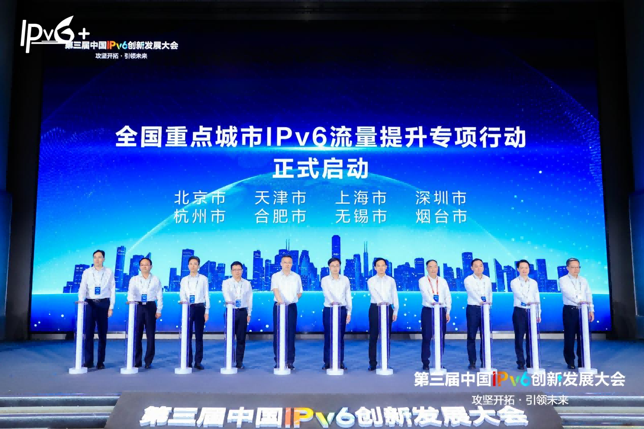 会议上,中央网信办信息化发展局局长温锐松、工业和信息化部信息通信发展司副司长赵策,与8个重点城市的领导共同启动了“全国重点城市IPv6流量提升专项行动”,着力提升重点城市IPv6流量,带动全国各地区IPv6发展水平再上新台阶。