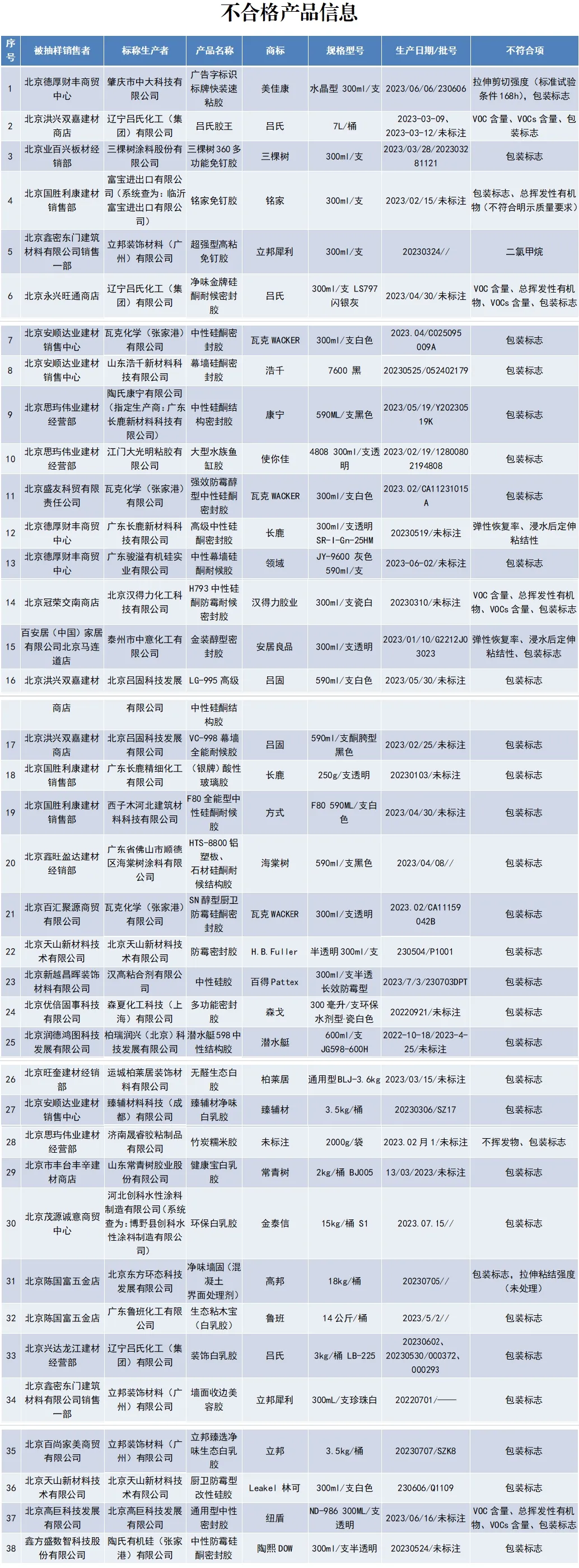 38批次不合格密封用填料及胶粘剂产品具体为: