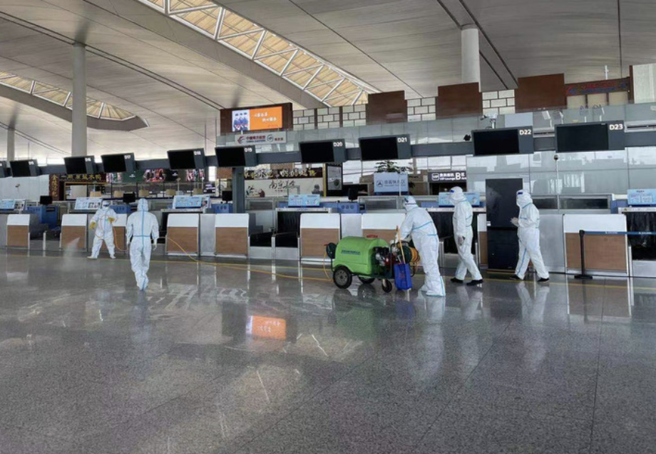 工作人员在南京禄口机场T2航站楼内进行消杀。 新华社发