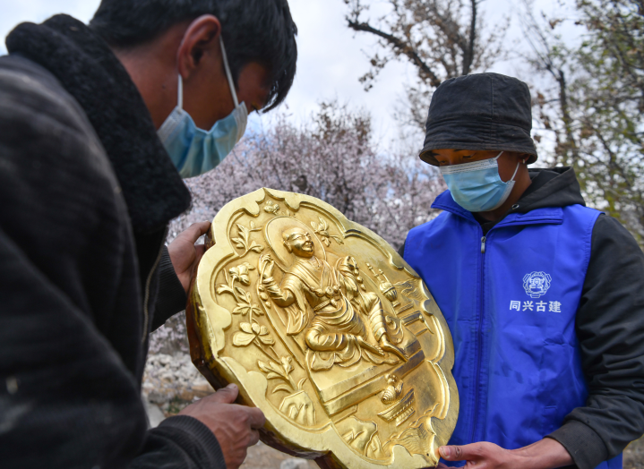 罗布林卡金顶鎏金屋面修缮工程维修人员正在检查刚刚鎏完金的装饰件(2021年4月2日摄)。 新华社记者 晋美多吉 摄