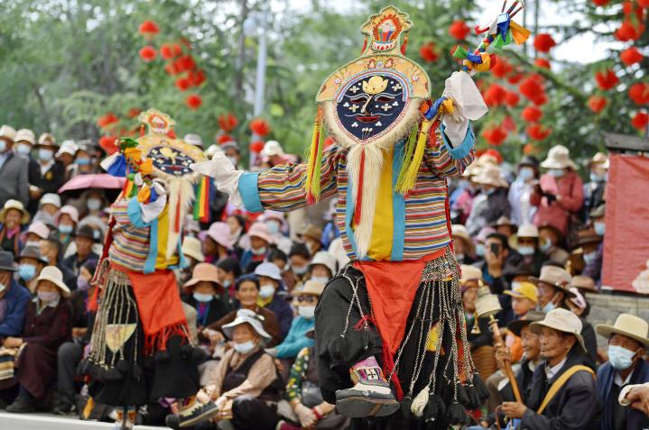 拉萨市堆龙德庆区马乡措麦村民间藏戏队在表演藏戏(2021年6月12日摄)。新华社记者 春拉 摄