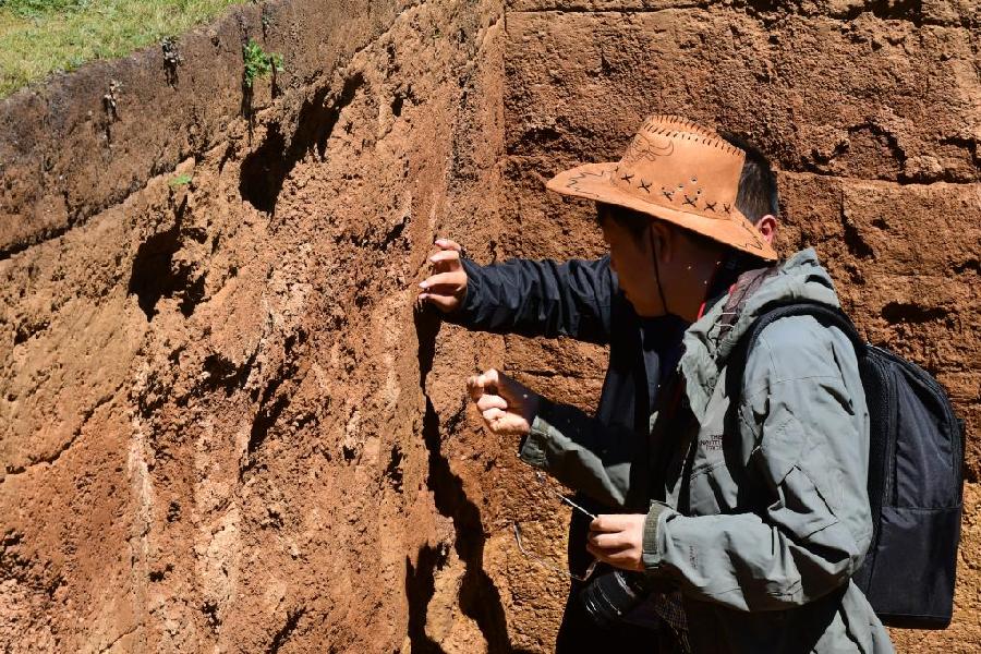 中国科学院院士、中国科学院青藏高原研究所所长陈发虎(前)在四川稻城皮洛遗址现场研究地层(9月12日摄)。新华社记者 谢佼 摄