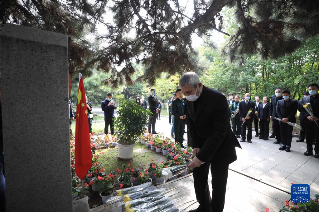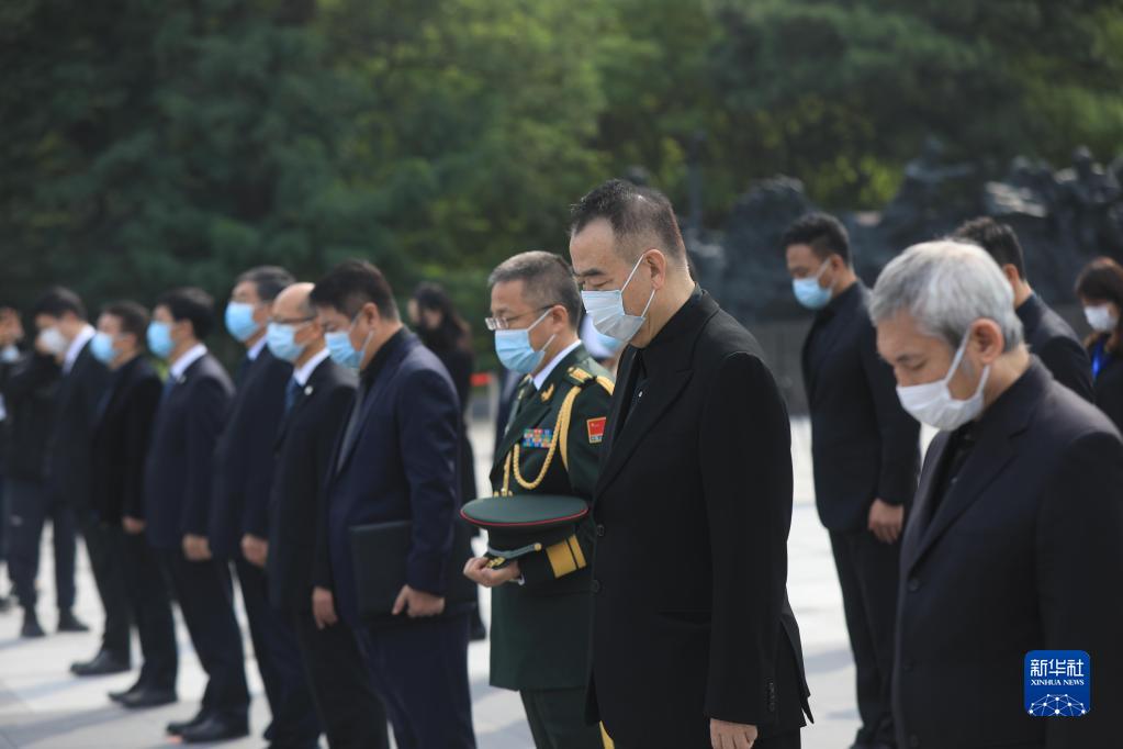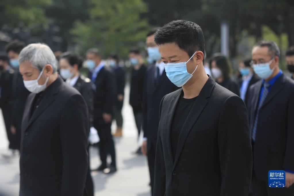9月30日,在沈阳抗美援朝烈士陵园,电影《长津湖》演员吴京(前右)在烈士墓前默哀。新华社记者 杨青 摄