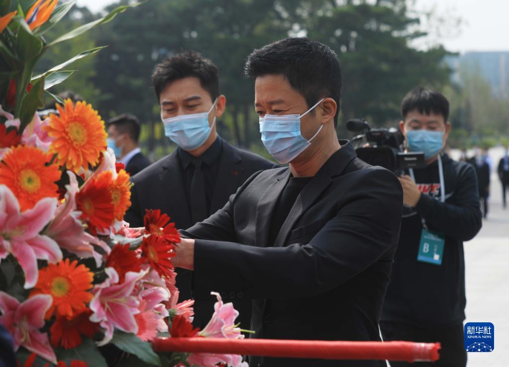 9月30日,在沈阳抗美援朝烈士陵园,电影《长津湖》演员吴京(右二)和李晨(右三)向烈士纪念碑敬献花篮。新华社记者 杨青 摄