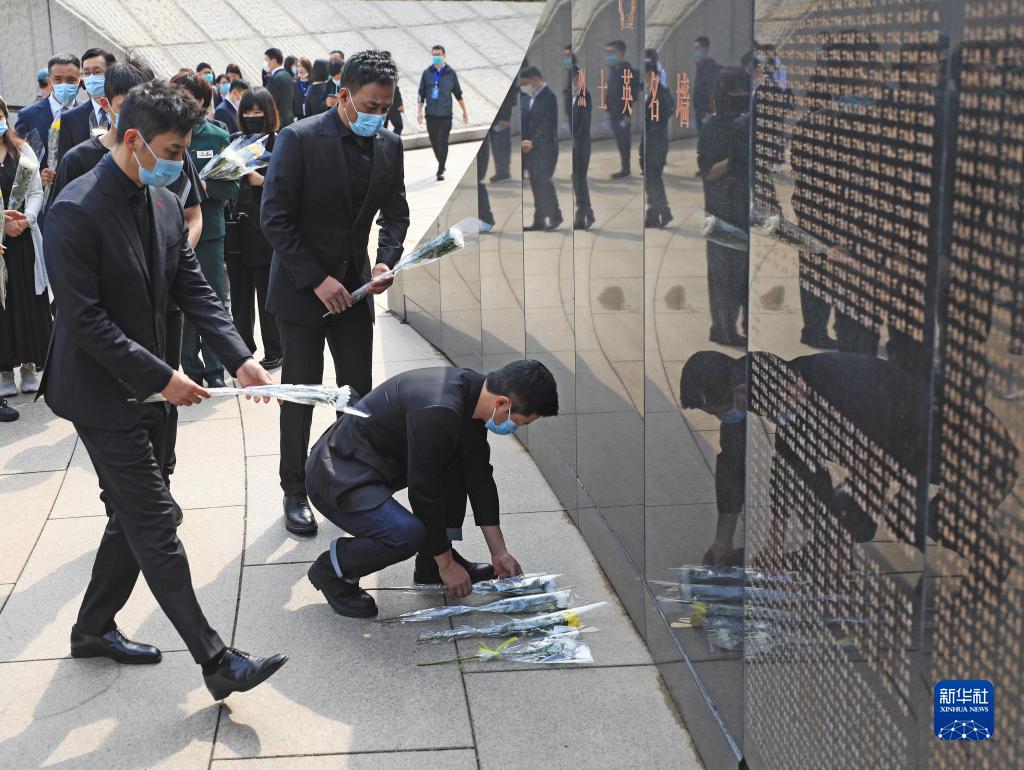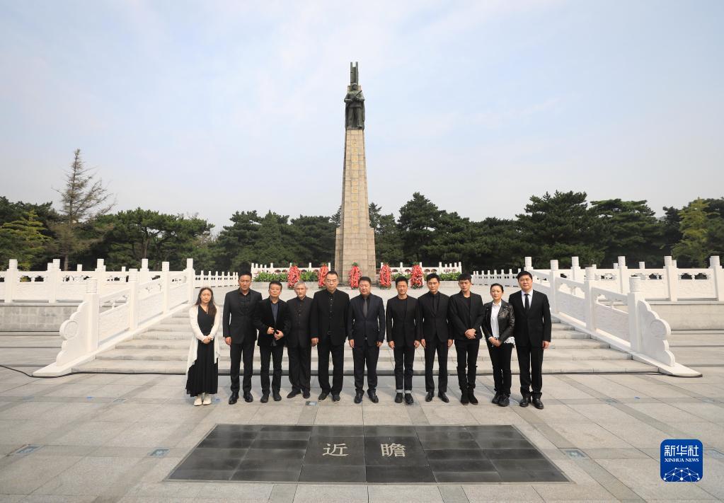 9月30日,在沈阳抗美援朝烈士陵园,参演电影《长津湖》的演员们向烈士英名墙献花致敬。新华社记者 杨青 摄