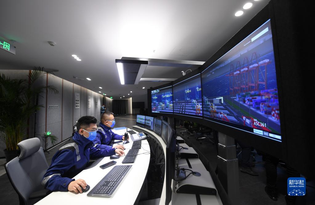 10月17日,工作人员在天津港北疆港区C段智能化集装箱码头智控中心内监控码头作业状态。新华社记者 赵子硕 摄