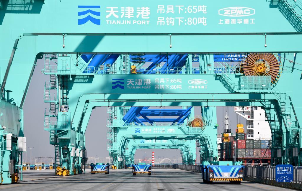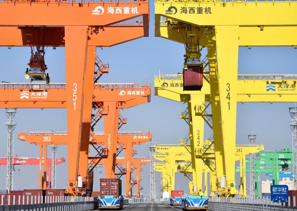 10月17日,智能水平运输机器人在天津港北疆港区C段智能化集装箱码头行驶。新华社记者 赵子硕 摄