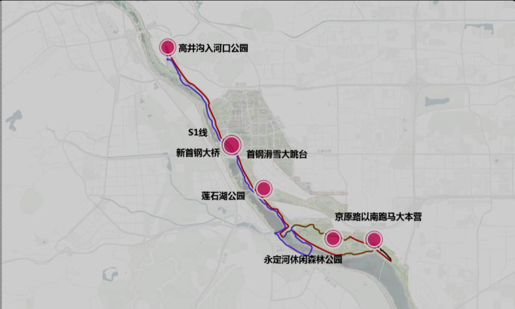 连接莲石湖公园、首钢滑雪大跳台等景点