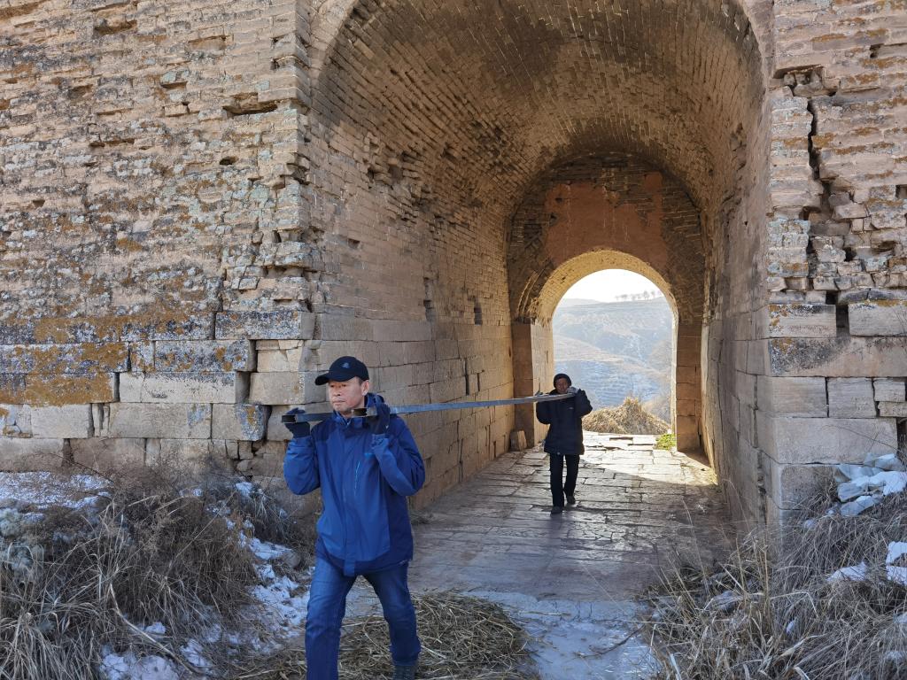 11月24日,贺文和老乡扛着梯子走向明代水窖。新华社记者王学涛摄
