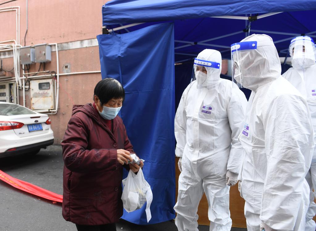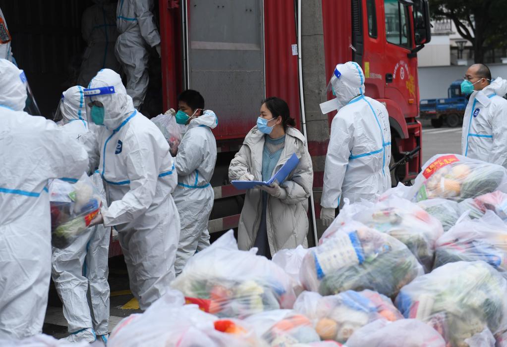 12月21日上午,上虞区曹娥街道金桂苑社区党总支书记、居委会主任祝祖英(右三)正在协调分配居民生活物资。 新华社记者 翁忻旸 摄