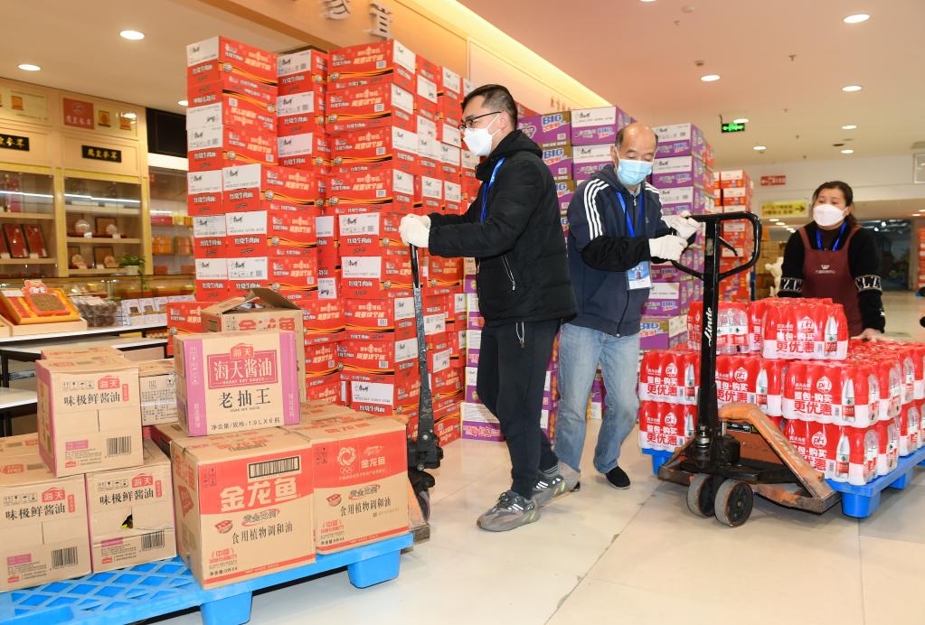 12月15日,在上虞区大通购物中心,工作人员在搬运需要配送的生活物资。疫情期间,该中心被临时征用为急需日用消费品配送中心。 新华社记者 翁忻旸 摄