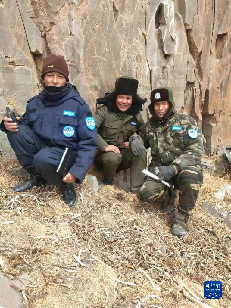 野生动物保护员强巴(右)和同事们在一起(资料照片)。新华社发(受访者供图)