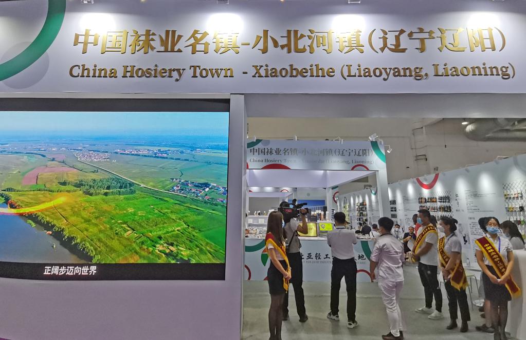 2021年9月10日,在2021中国(大连)国际服装纺织品博览会上,来自辽宁省辽阳市的小北河镇被中国纺织工业联合会和中国针织工业协会授予“中国袜业名镇”称号。新华社发